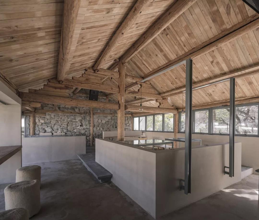 在四周围起夯土墙面,维合着庭院将人们聚集到一起,低矮的入口只有低头才能进入,表达一种谦虚的态度。而餐厅内有一棵树,从平地破土而出。这和赵雷专辑的封面及音乐理念十分契合~