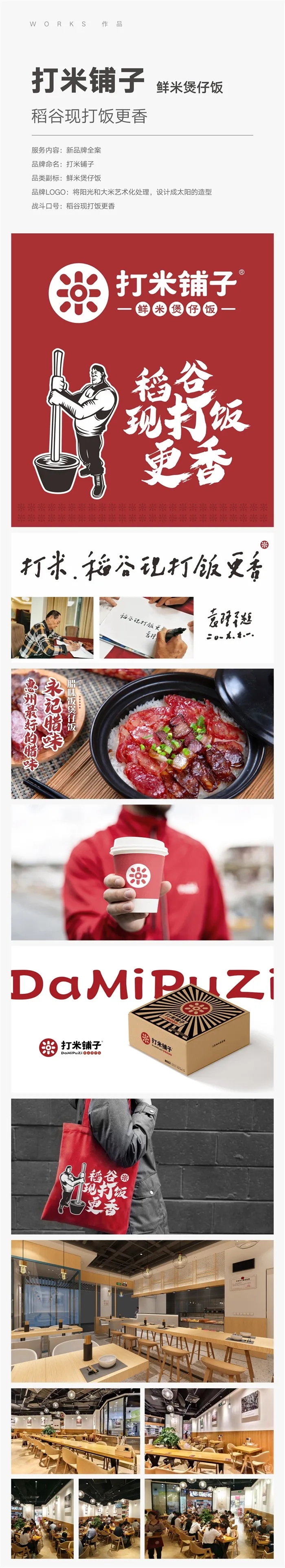 【面子工程亮点】一个“打”字动作感十足,“打米铺子”四个字很有画面感;名字“打米铺子”、品类副标“鲜米煲仔饭”、战斗口号“稻谷现打饭更香”互为依存和因果关联,解决了你是谁?有什么不同?何以见得?市场为什么需要你…品牌的立足之本(定位);品牌专属设计字体、LOGO标识、VI主色、店面装修风格都有较高的识别度和记忆点;墙面袁隆平院士与创始人合影的照片,以及袁老给打米铺子的题词、店里摆放的稻谷脱壳机、店门口飘出的米饭香味都是“稻谷现打饭更香”的信任状;打米铺子第一家店开业即引起轰动,当地媒体竞相报道。煲仔饭在广东是一个低价和烂大街的餐饮品类,将煲仔饭开到深圳、杭州等一线城市的一线MALL里,打米铺子是第一家!
