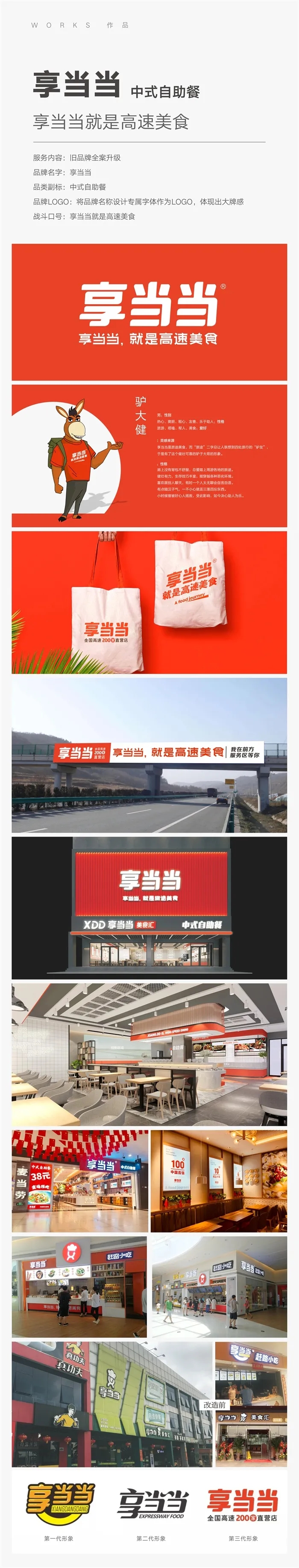 【面子工程亮点】享当当在全国多地省市高速公路服务区的门店数量超过200家,涉及餐饮、超市、客房、小吃等多种业态,在国内高速公路餐饮同业中具有相当高的知名度,但在普通顾客心目中,享当当旧的品牌形象陈旧且不够大气,不是具有200多家店面品牌该有的样子,旧的形象也制约着品牌的发展。餐赢计给品牌定位为“高速公路美食”,并围绕这一定位,着力解决顾客对高速公路服务区餐饮店“脏乱差”的旧认知,餐赢计承担的面子工程包括文案、VI体系、各种物料、店面空间效果。新形象整体风格简洁明亮,给顾客以舒适干净的体验,完全颠覆了传统高速公路服务区餐饮“脏乱差”的印象,也很好解决了客人对公路餐饮不信任的问题。