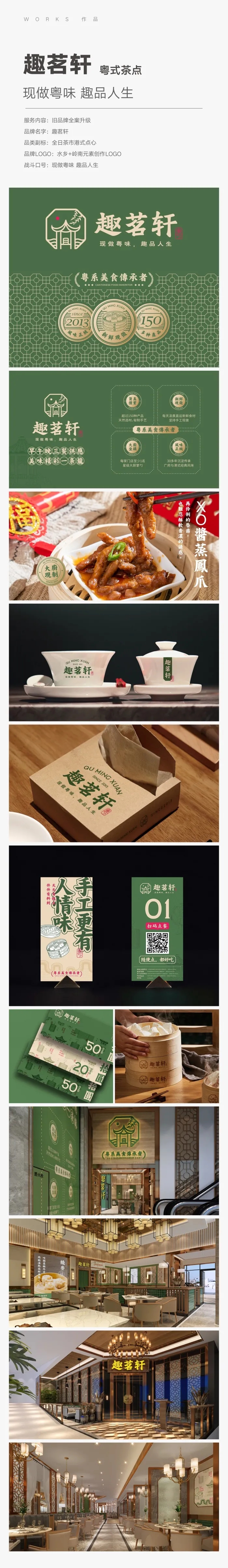 【面子工程亮点】趣茗轩是发源于东莞水乡片区的茶点餐饮品牌,在深圳、广州、东莞都有店面,店面面积都在800平方以上。品牌原有定位不清晰,各家店面的副标和门头招牌都不相同,品牌优势和主张没有明确。餐赢计经过调研和对市场的认知,将茶点的核心消费群体定位为“在广东的外省人”,而大部分的外省人都以为广东的早茶只是吃早茶的,中午和晚上就没有了,所以,“全日茶市”解决了店面全天营业的问题;将“粤味”作为品牌文化(在外省人眼里,一个“粤”字即代表了广东的一切),将“粤式茶点”作为拳头产品,“现做”作为产品特色;VI我们用了现代时尚的表现方式;空间设计,我们用优雅别致的现代风格,摆脱常规、老气的传统茶楼印象。趣茗轩品牌升级后的第一家店是开在深圳,这个一线城市年轻,接受力强,所以我们为品牌所做的改造升级相对超前和时尚。