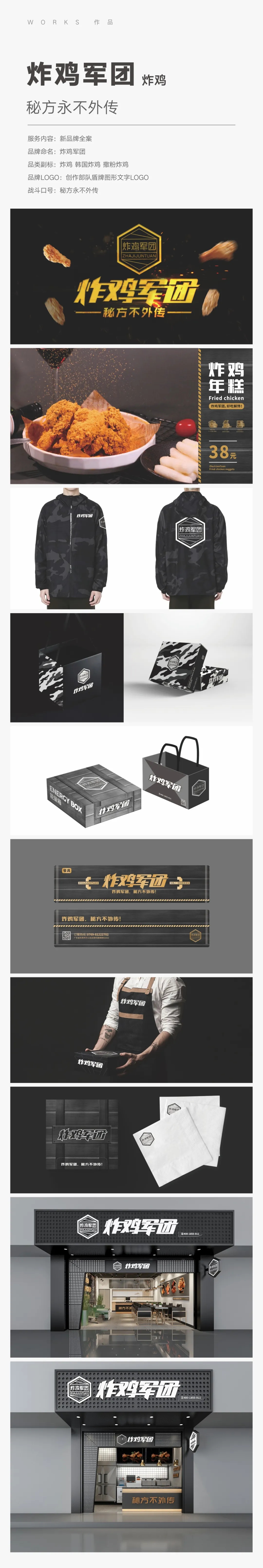 【面子工程亮点】品牌策划设计从炸鸡主流消费者画像入手,分析他们的日常生活、兴趣爱好、消费审美及价值观等,结合年轻人喜爱的游戏元素,让品牌散发潮流个性、展现青春活力的姿态。名称“炸鸡军团”蕴含趣味化的游戏语言要素,口号“秘方不外传”定义品牌优势,解决了同行竞争中的差异化问题。LOGO的设计灵感来源于军队令牌、游戏盾牌等具有重型力量感的元素,色彩选择黑金搭配,让整体更加高级炫酷、动感有力,传递品牌的硬汉军团精神;餐具、服装、海报等物料采用有趣调侃的文案表达,设计简约而不简单。空间延续黑白金配色,独特的门头造型迎合年轻消费者的审美,墙面以精美海报驱散暗沉,避免传统小吃店的复杂繁琐。内部分为上下结构,设有休闲区、就餐区、打卡拍照区,最大化利用空间面积;创意的打卡墙让消费者在用餐时,也可以和品牌娱乐互动,助力品牌快速传播。