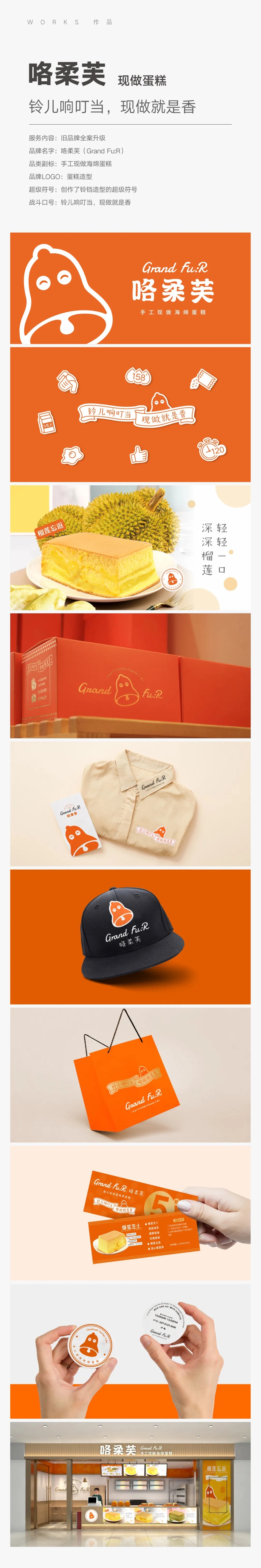 【面子工程亮点】原品牌形象识别度不高,特别是中文名称,认知很困难;新设计的名称字体更容易认读;创作了铃铛造型的超级符号;在每家店面都安装了手摇的铃铛,每当蛋糕做好了,就摇动铃铛,加上现场刚出炉蛋糕飘出的浓香,馋的人直流口水,路过的顾客想不买都难!战斗口号“铃儿响叮当,现做就是香”,既有描述了场景,也传递产品特点;VI 主色采用了温暖的橙红色;店面不大,为了压缩装修时间,所以设计尽量模块化、标准化。