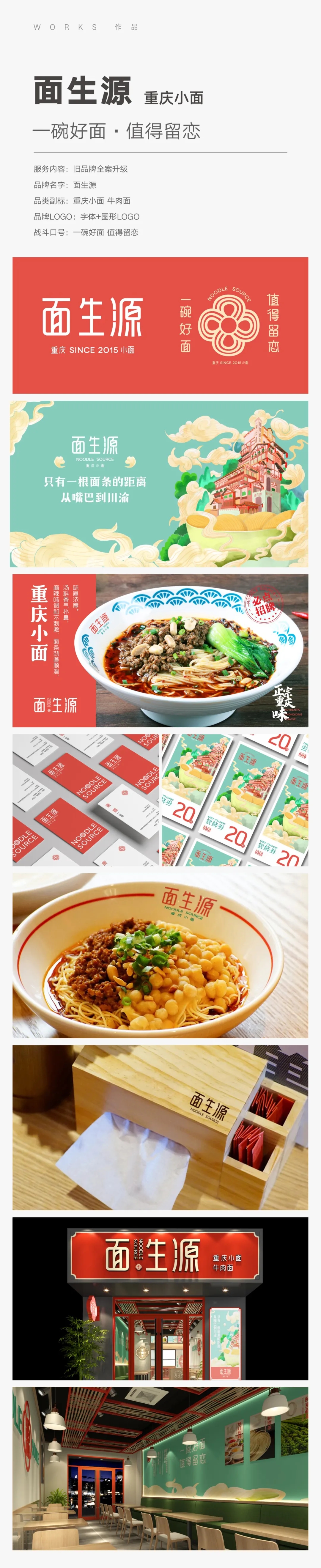 【面子工程亮点】面生源在分店达到50多家之时,旧形象已无法与品牌体量匹配。重庆小面是一个烂大街的产品,餐赢计决定从情怀入手,提炼广告语“一碗好面 值得留恋”;全新LOGO设计,以面条、中国结、山茶花、四叶草为创意源,降低消费者记忆成本和品牌传播成本;色调选择以偏柔和的橙红色和蓝绿色为主,更时尚明媚;空间以简、平、快的风格实施动线布局和视觉包装干净舒心;拍摄新的品牌宣传短片在门店循环播放。老牌面生源,在经过面子工程升级后,重新拥有了青春模样,焕发出新生机,更加时尚有活力,川渝文化和怀旧乡情的融入,也让时尚更有“人情味”。