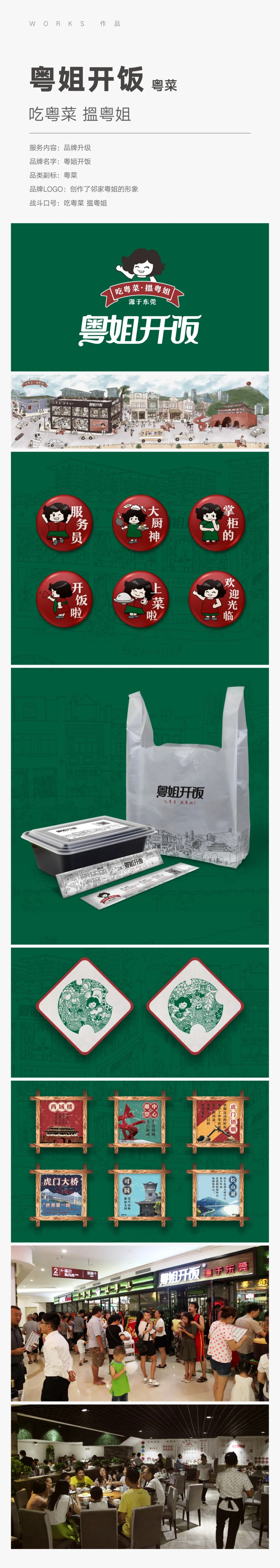 【面子工程亮点】粤姐开饭,扎根东莞多年,是一家东莞本地人熟知的粤菜餐厅。随着时代的发展,她在面子工程这一部分有些落后于同行。餐赢计通过线下沟通调研,发现很多消费者都认为“粤姐开饭”中的“粤姐”应该是一位亲和友善的本地邻家大姐,于是决定设计“粤姐”这一形象,让她成为品牌超级IP;LOGO手绘设计了“粤姐”这一接地气、亲切和蔼的形象,添加战斗口号“吃粤菜 搵粤姐”,同时运用品牌餐具、宣传单、服装等,让品牌更加图形化、视觉化;视觉文化设计追根溯源,挖掘文化母体,即粤式风情,增强品牌生命力。