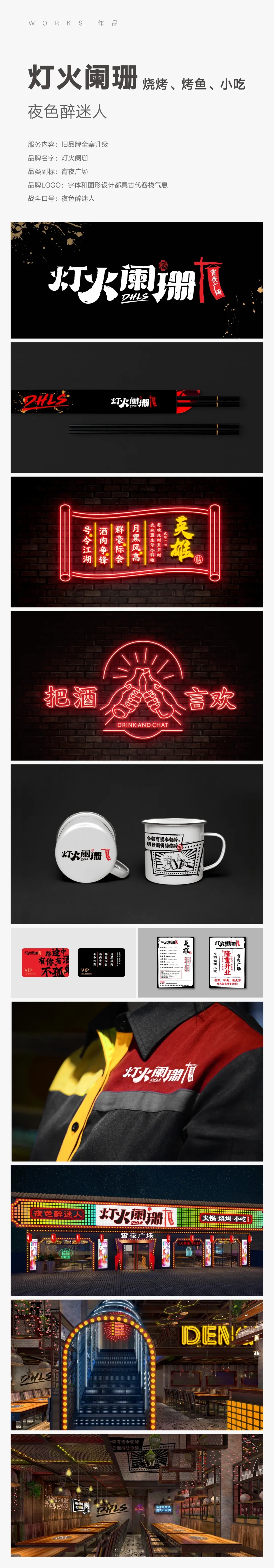 【面子工程亮点】灯火阑珊是纯晚餐和宵夜模式,主要消费群体是年轻人。大部分的晚餐和宵夜烧烤店,都不注重餐厅门头和内部的设计。“灯火阑珊”重新强调门头和内部空间设计,将多种色彩和霓虹灯运用于门头和空间各处,强化品牌门店识别度和对年轻人群的吸引力,增加门店时尚感;店内所有口号、标语、装饰,设计霓虹效果,凸显魅力之夜,为用餐环境融入酒吧特有的明暗恍惚的意境;灯光色彩自带滤镜,提升顾客拍照分享满意度;空间风格大胆前卫,木质和铁质选材的相互融合,暖热交替,更加酷炫时尚。