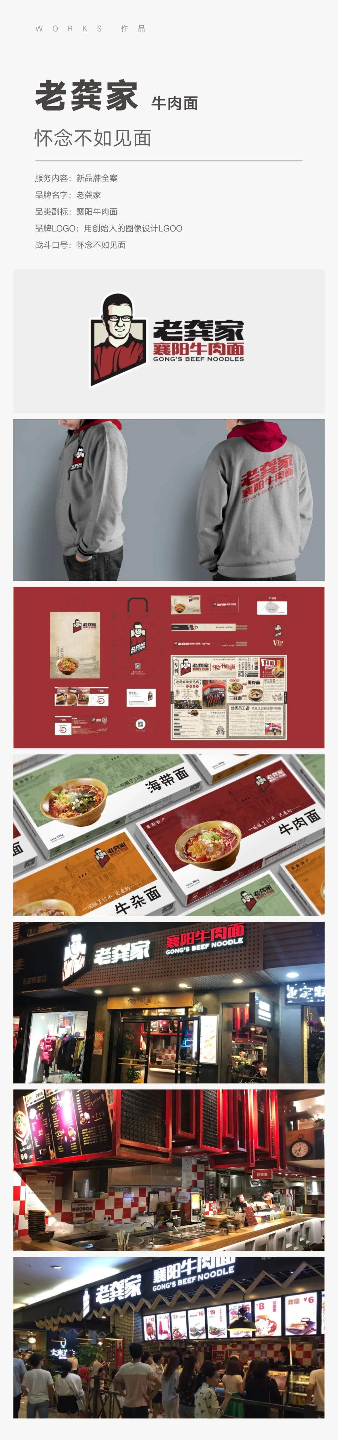 【面子工程亮点】如何让一碗牛肉面成为一个经典品牌,餐赢计策划了一个关于创始人和父亲的暖心故事,提炼出广告语“怀念不如见面”,为这碗面赋予了情感,品牌名称“老龚家”也由此而创作。品牌LOGO符号依照创始人老龚原型做艺术化处理设计,视觉传达,从色彩、图形、符号等元素,渗透岁月怀旧气息;菜单、打包袋等物料的材质选择复古牛皮纸色彩,从点滴中传递出“怀旧”和“亲情”这两大品牌主张。老龚家襄阳牛肉面门店数量不断增多,目前已经扩展到全国各大高速公路服务区,而老龚也成为了襄阳人人熟知的知名餐饮人。随着老龚家品牌扩展到全国,为了弱化品牌的地域特色和迎合市场,所以将“老龚家襄阳牛肉面”,改为“老龚家牛肉面”。