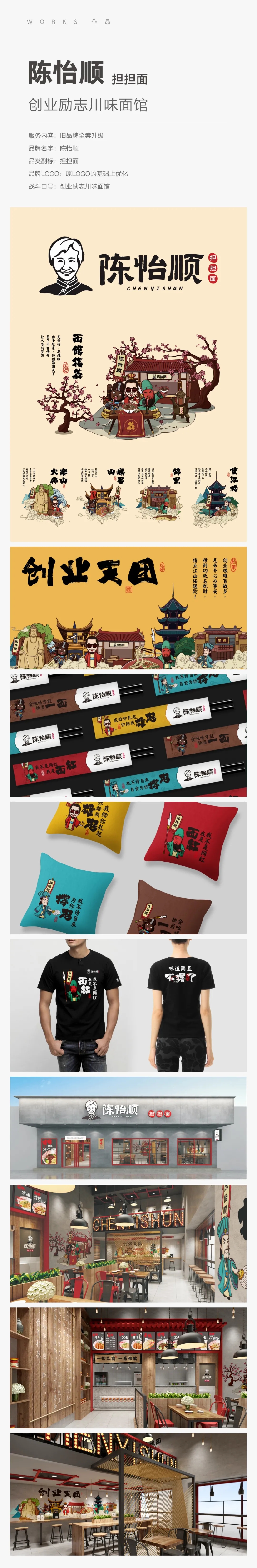 【面子工程亮点】担担面是四川的市井小吃,陈怡顺品牌店面分布于广东珠三角,主要走加盟路线。旧的店招主体部分有的是“担担面”,有的是“怡顺担担面”,形象不统一,“面子工程”中,唯一具有价值的就是“陈怡顺担担面”。餐赢计挖掘品类地域背景和文化母体,使品牌的加盟创业与三国演义中“蜀国”白手起家的故事相结合,将“三国”这个超级IP植入到品牌中,并由其而创造出一系列的IP人物形象;重新设计了标准规范的VI视觉系统和很有个性特点的店面形象;升级后,品牌的“面子工程”焕然一新,有趣乐观的品牌形象年轻了很多。高峰时期,陈怡顺的店面数量达到了300多家,是当之无愧的担担面第一品牌,也是第一个将四川的单品小吃带到广东且开店数量最多的品牌。