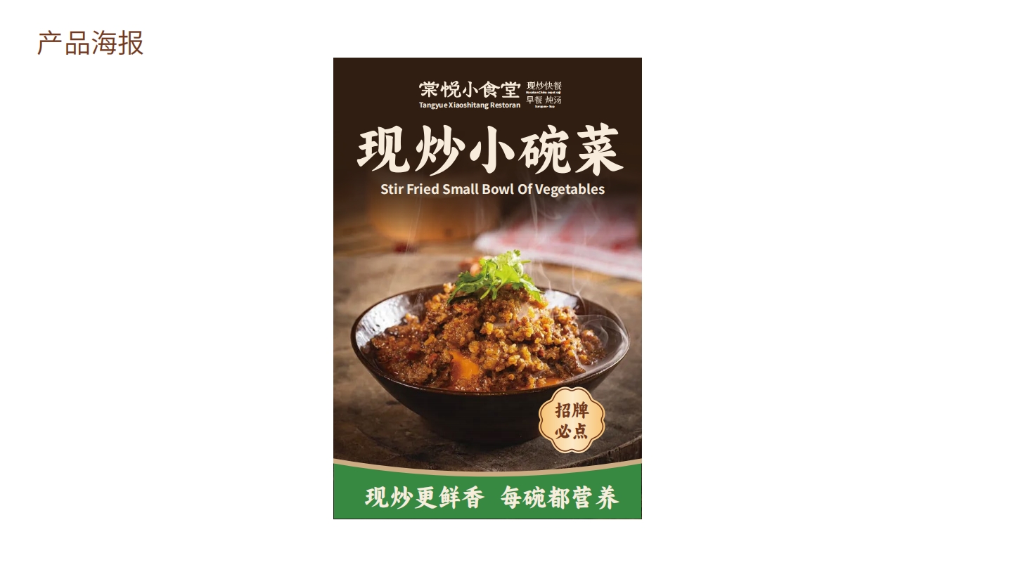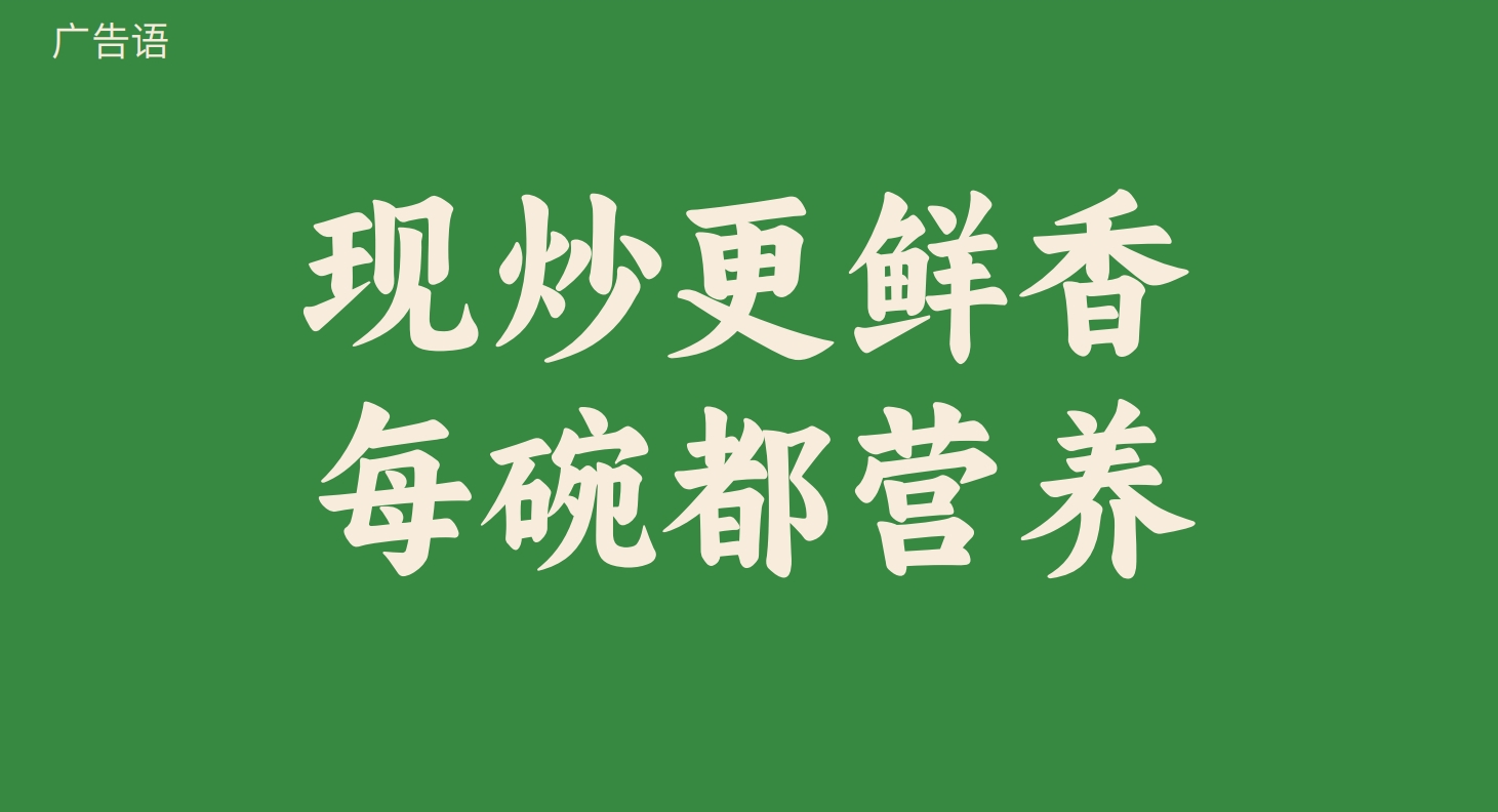传播效率:广告语“现炒更鲜香,每碗都营养”以“现炒”强化工艺、“营养”直击健康需求,配合副标题“现炒快餐·早餐·炖汤”,3秒内完成品类与价值传递。