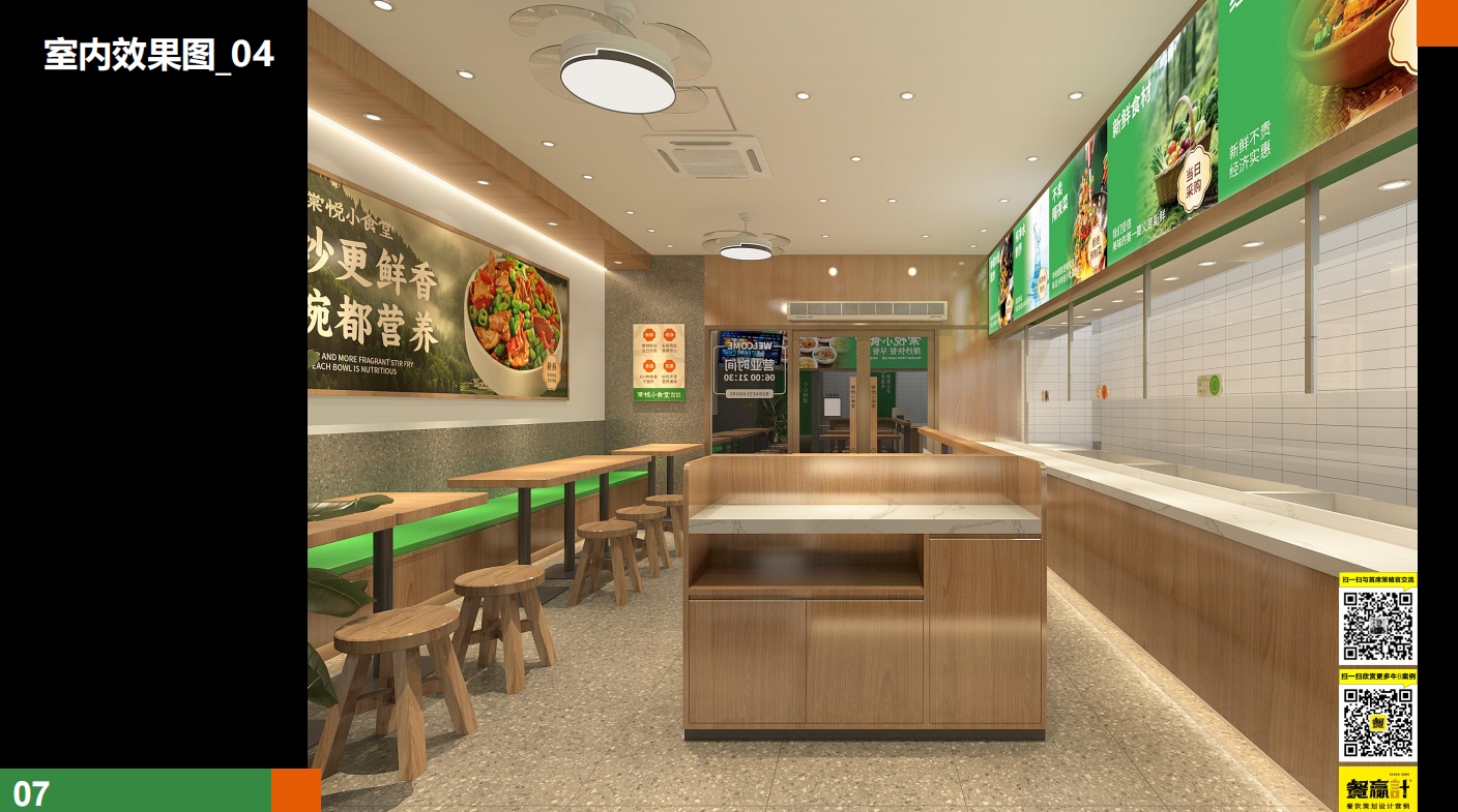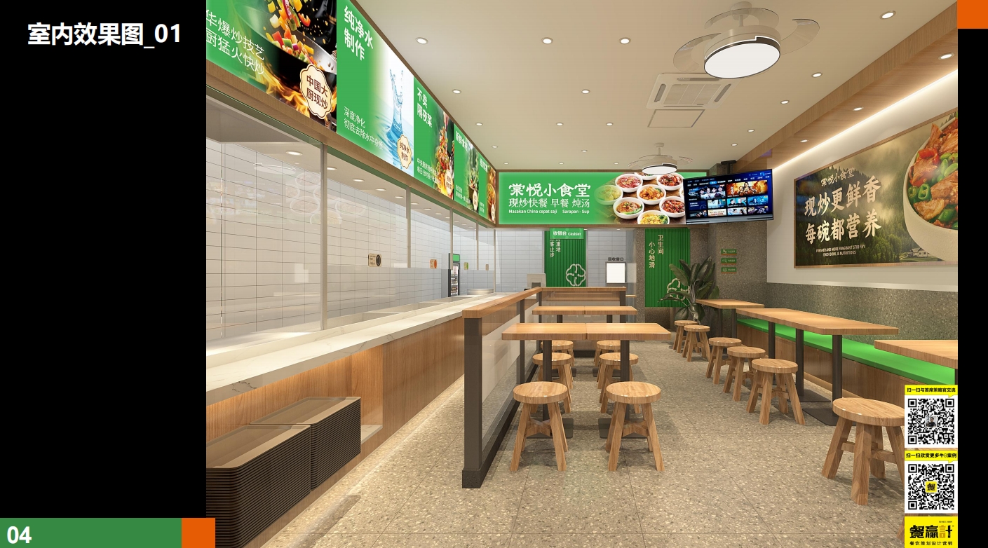 场景层:导视灯箱(如“30道现炒自选,3步取餐”)简化消费动线,提升坪效。