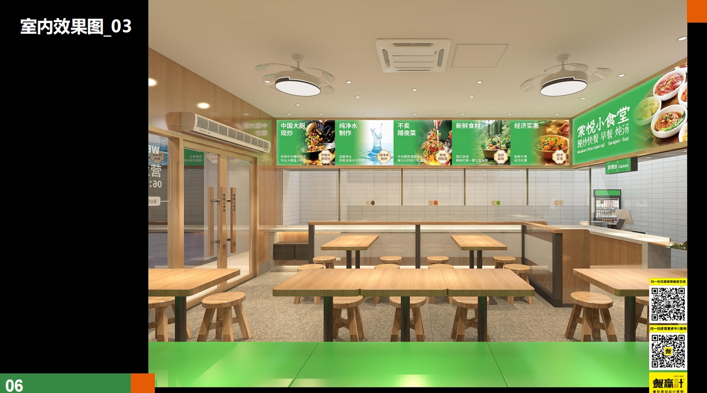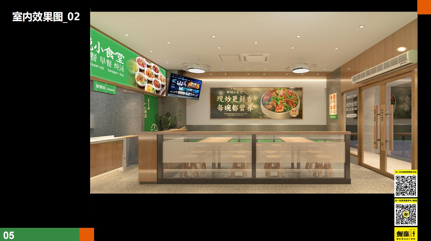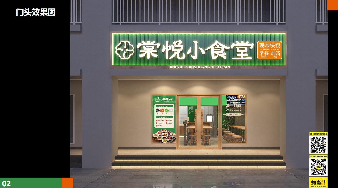 色彩体系:稻谷绿(健康)、丰收橙(食欲)、米白(干净)构建视觉记忆点,应用于门头、灯箱、餐具包等高频接触点,形成“看到绿色=想到现炒健康”的条件反射。