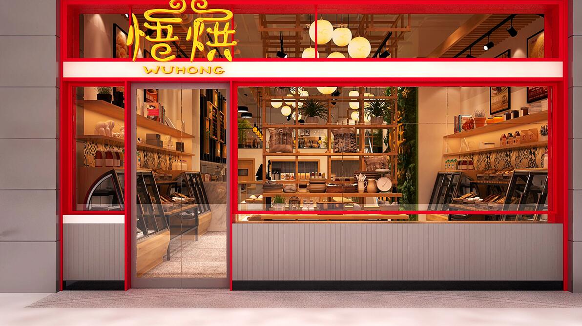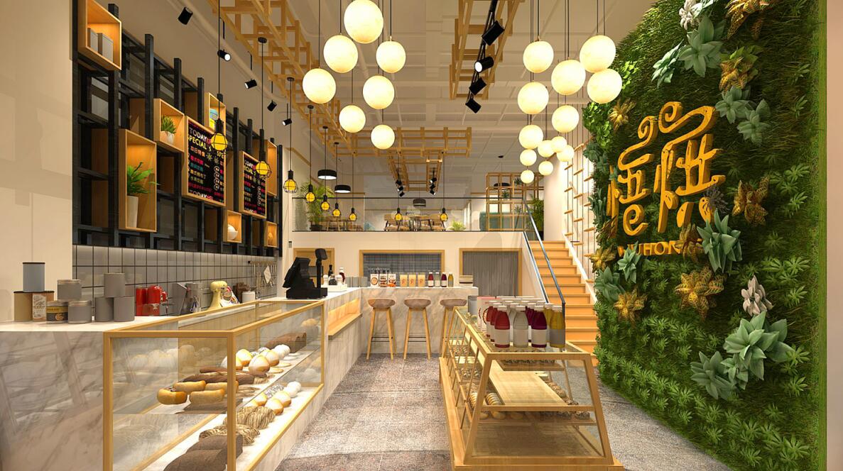 悟烘面包门头选用炫酷的亮红色,更加吸引消费者进来品尝。空间内部氛围上下两层,植物软装,黄色灯饰,原木餐桌椅,午后休闲的田园风,扑面而来。在这里,你就是快乐自由的面包大圣。