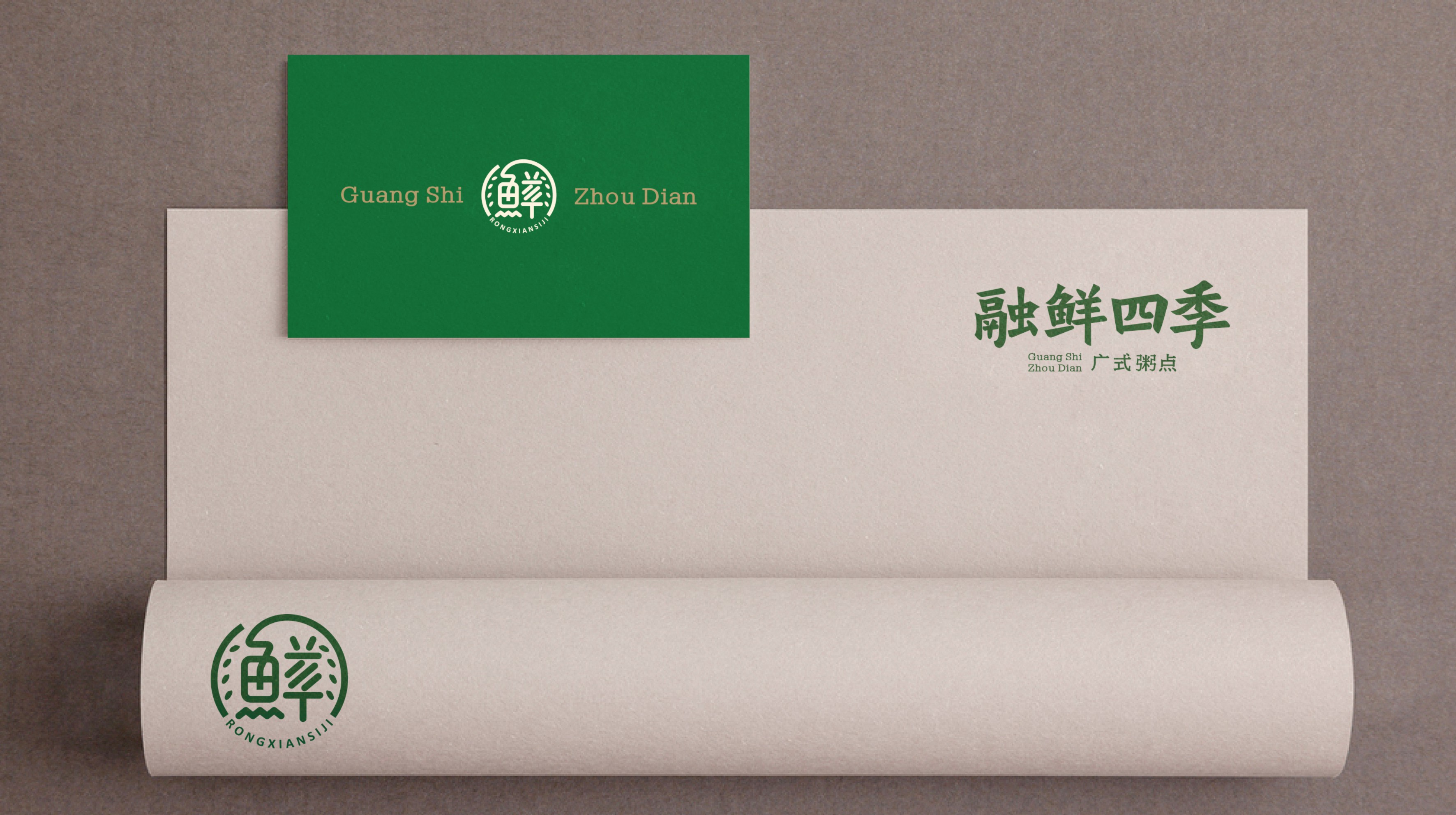品牌符号创意字体演绎的品牌核心“鲜”字。字体删除了不必要的横竖笔画,简约大气,颠覆传统书写规范。品牌符号中对融鲜四季符号的创作艺术简洁,能够清晰辨别“鲜”字的笔画和品牌的新鲜美味。色彩搭配:图形、字体、线条整体以复古稳重的绿色为主,表示食物的新鲜健康,也表现品牌用餐空间的干净整洁。