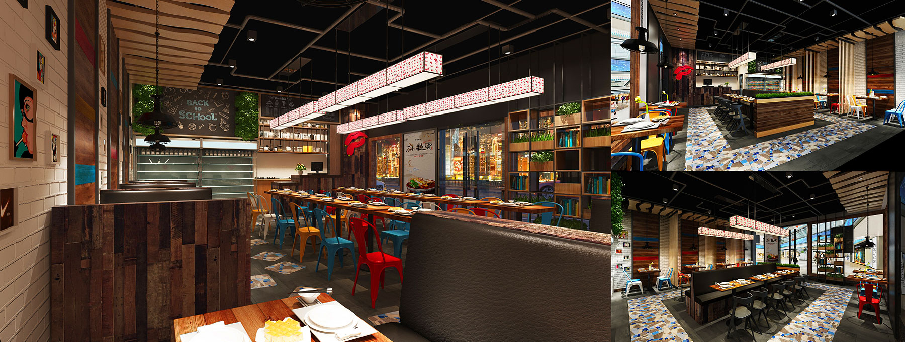 门店空间定为时尚的轻工业风格,看似无序却井井有条,布局和灯光的设计不拘小节,多彩文化和抽象艺术之间互相碰撞。通过这种活泼、时尚、小而精的风格效果,品牌能够不拘泥于常规,而让用餐体验变得轻松潮趣,畅快愉悦。