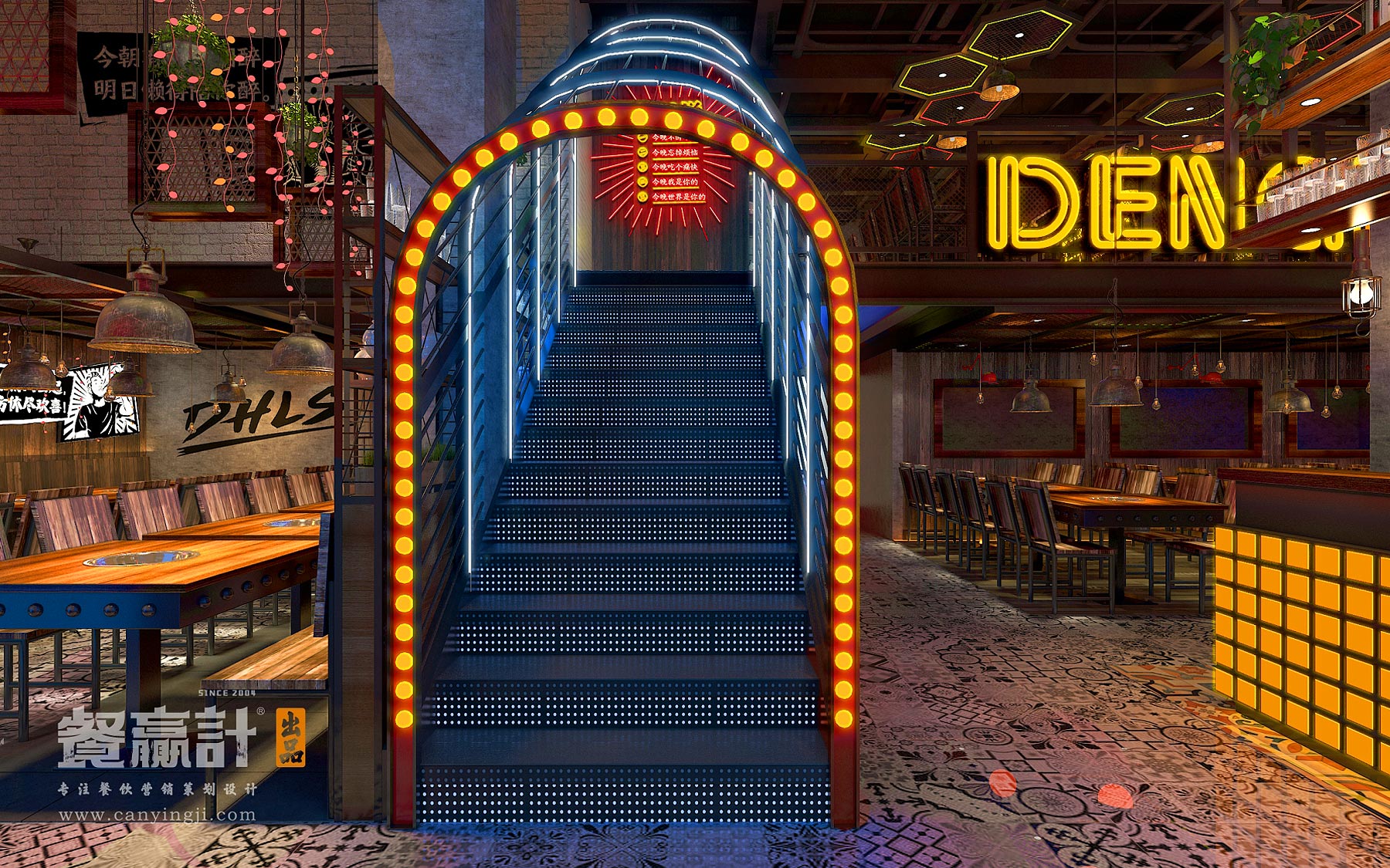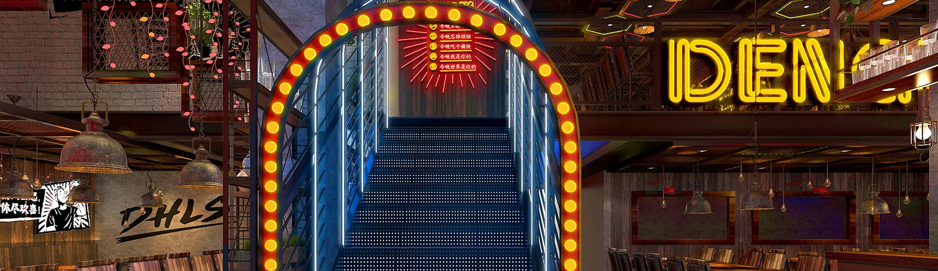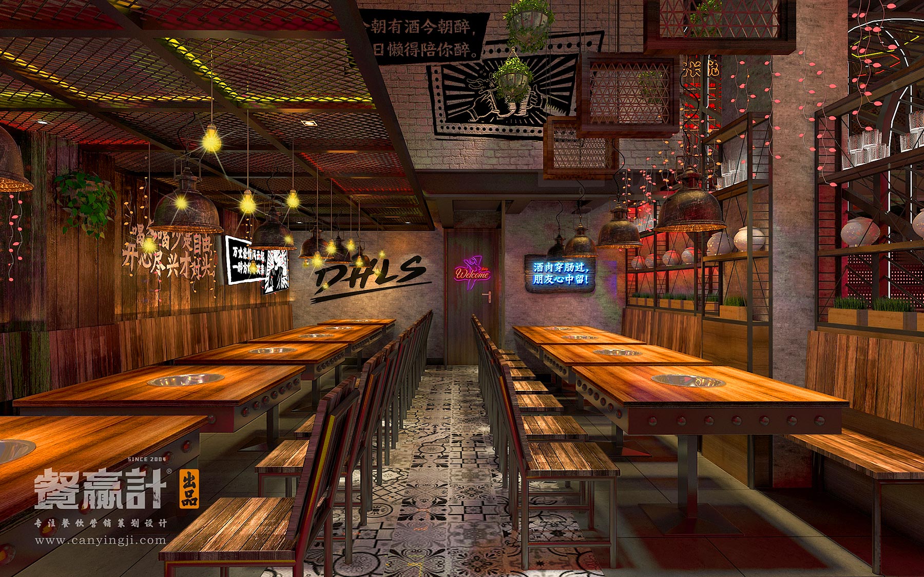 门店空间经过餐赢计的设计与监工,一股大胆的风尚已然成型。设计师将品牌VI系统搬过来,让室内外保持统一的视觉概念;除了强化门头招牌的识别度和吸引力以外,还为用餐环境融入酒吧特有的明暗恍惚的意境。插画标语及其他装饰增添了耐人寻味的印象,霓虹灯的效果则勾勒出光怪陆离的年代感与通俗感,可令人迷醉于其中,让烦恼淡出、让真情酝酿,达到“夜渐深,味越美,情更浓”的体验氛围。
