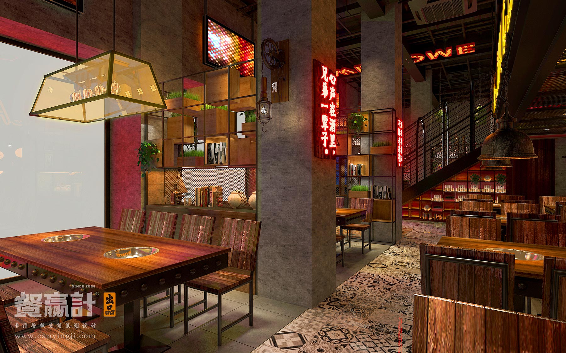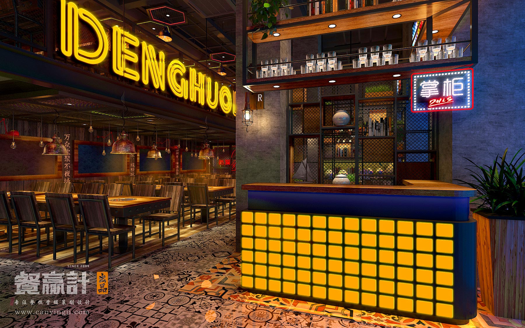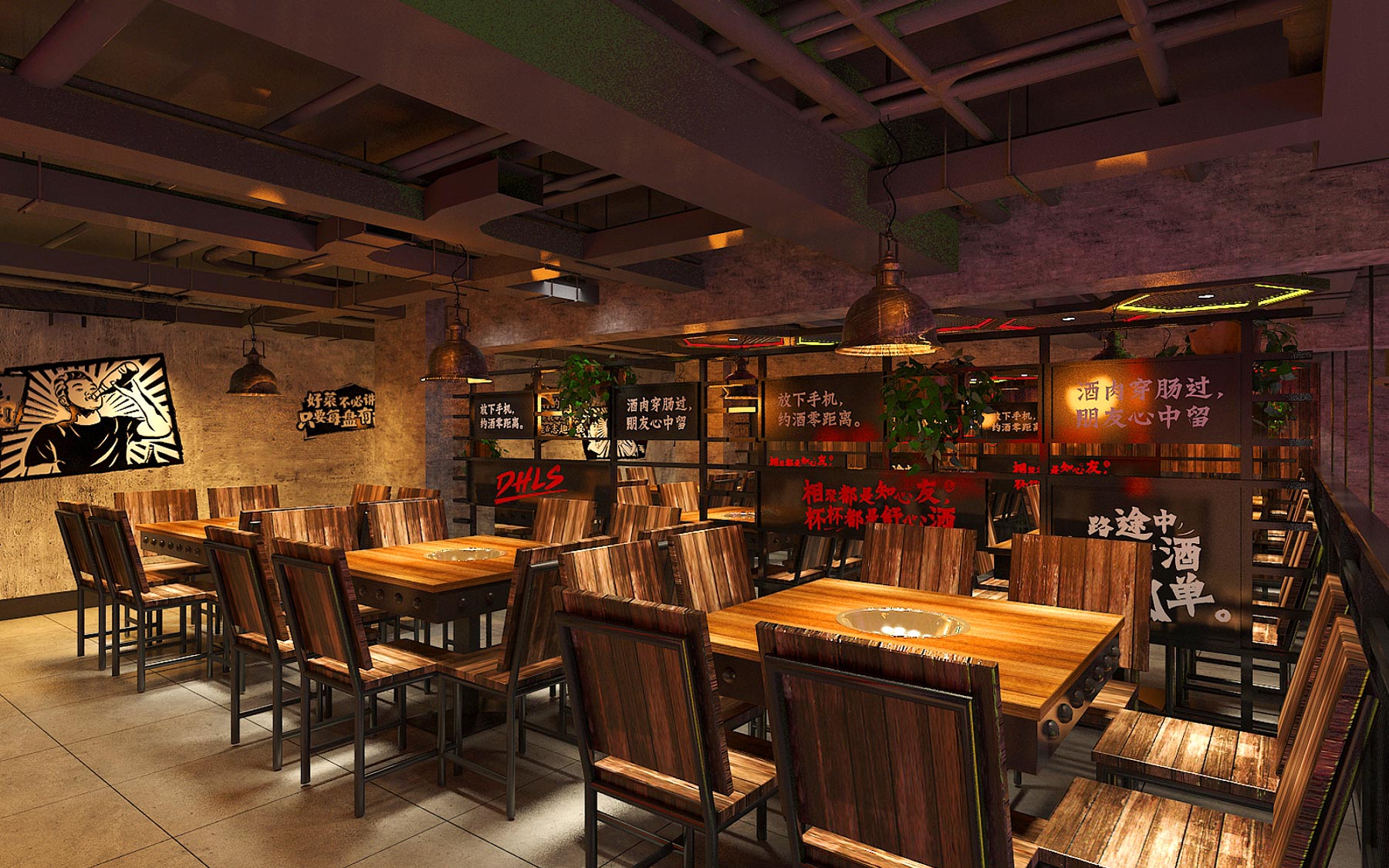 门店空间经过餐赢计的设计与监工,一股大胆的风尚已然成型。设计师将品牌VI系统搬过来,让室内外保持统一的视觉概念;除了强化门头招牌的识别度和吸引力以外,还为用餐环境融入酒吧特有的明暗恍惚的意境。插画标语及其他装饰增添了耐人寻味的印象,霓虹灯的效果则勾勒出光怪陆离的年代感与通俗感,可令人迷醉于其中,让烦恼淡出、让真情酝酿,达到“夜渐深,味越美,情更浓”的体验氛围。